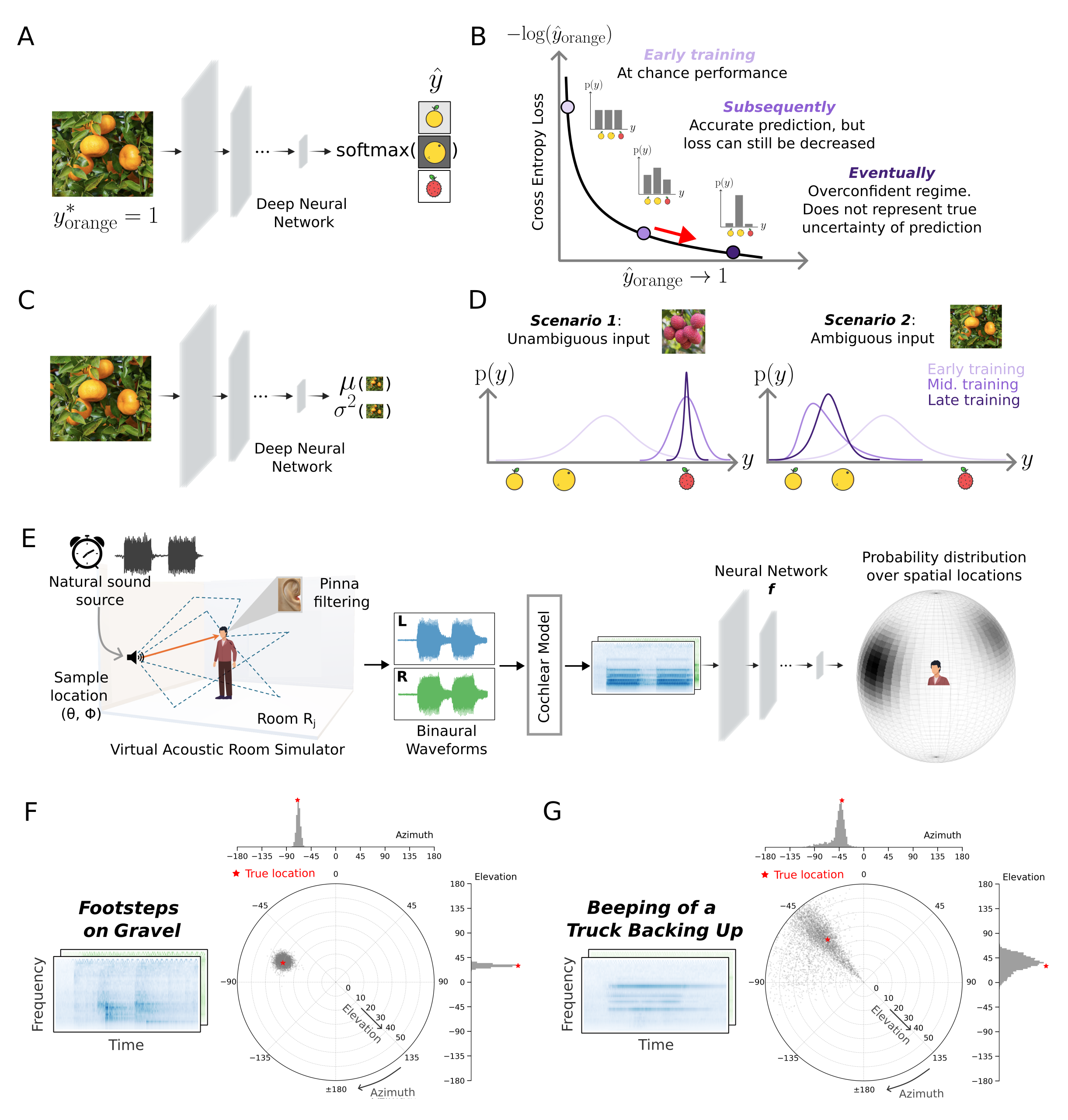 Conceptual sketch and application of the proposed computational framework to sound localization. A. Canonical neural network for classification. B. Schematic of consequence of training a model with the cross-entropy loss function. C. Neural network that outputs parameters of a univariate Gaussian. D. When optimized with a maximum likelihood loss function, the model should learn to predict narrow distributions when actual uncertainty is low, and wider distributions when actual uncertainty is high. E. Model framework applied to sound localization. Training data is generated using a room simulator that yields the binaural audio signals that would enter the ears of a person at a particular location in a room listening to a sound at another particular location. The audio signals are passed through a fixed model of the cochlea followed by a neural network. The neural network predicts the parameters of a von Mises mixture distribution of locations over a sphere surrounding the listener. F. Posterior distribution for trained model for the sound of footsteps on gravel. This sound can be localized relatively precisely, and the model accordingly produces a narrow posterior. The posterior is visualized with Monte Carlo samples plotted in polar coordinates, with azimuth on the circular axis, elevation on the radial axis, and marginals shown as top (azimuth) and right (elevation) histograms. G. Posterior distribution for trained model for the beeping of a truck backing up. This sound’s location is relatively ambiguous, and the model accordingly produces a broader posterior.